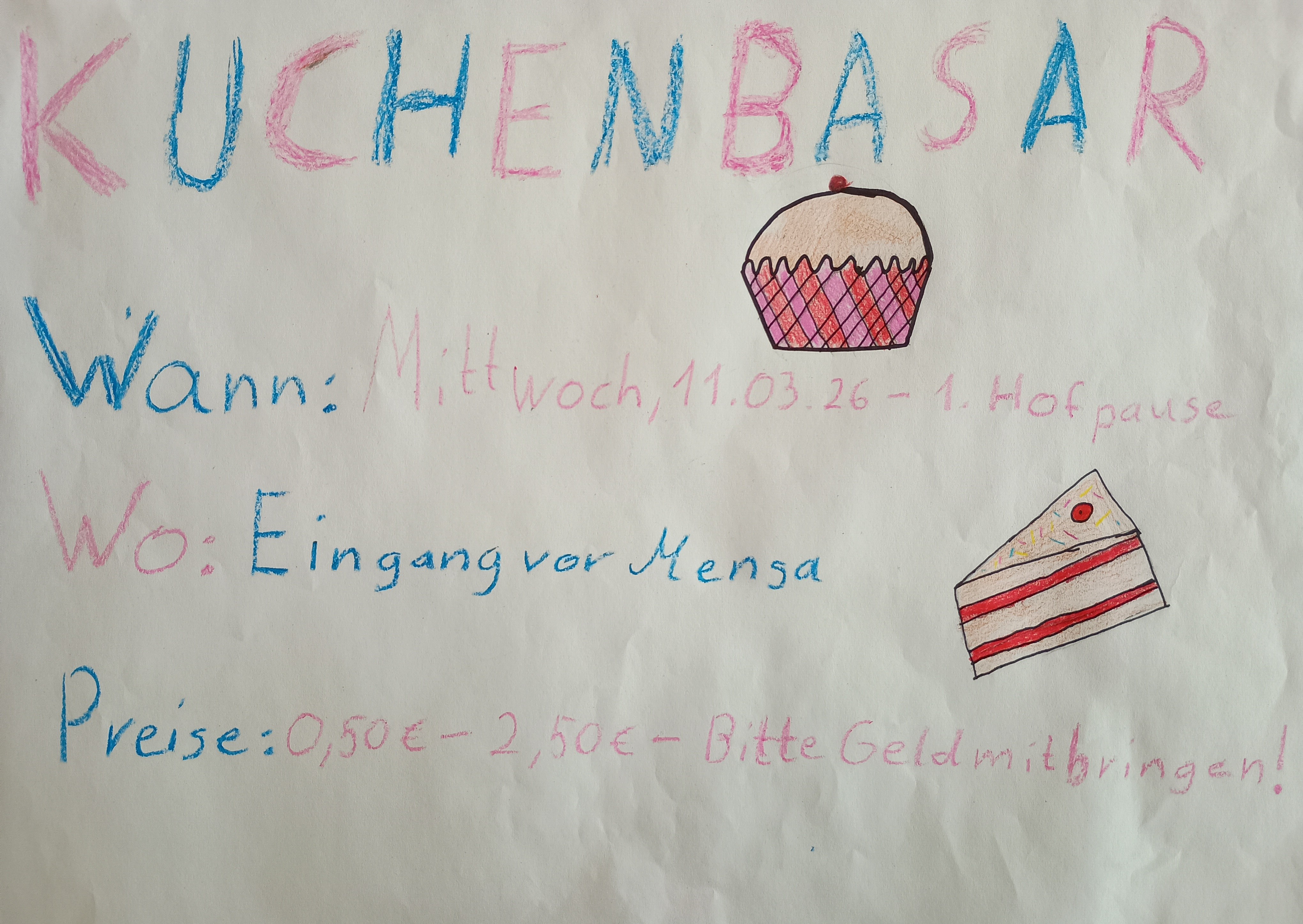 Die Klasse 6a hat am 11.3.2026 einen Kuchenbasar veranstaltet. Wir hatten viele Leckereien, selbstgebackenen Kuchen, Wurst in Blätterteig und vieles mehr. Den Kindern hat es gut gefallen und am Ende war alles ausverkauft. Wir haben genug Geld gesammelt für unsere Klassenkasse.